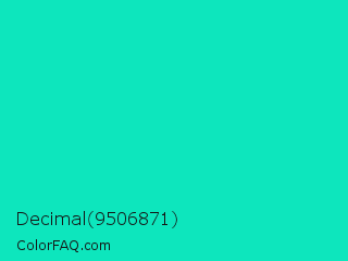 Decimal 9506871 Color is a normal cyan color and the nearest color is Robins Egg Blue #00cccc. Hex code #0de6bd and RGB value is rgb(13,230,189). In RGB color space, this color is composed of 5% red, 90% green, 74% blue, In CMYK color space, this color is composed of 94% cyan, 0% magenta, 18% yellow , 10% black , In HSL color space, this color has a hue angle of 169° , 89% saturation and 48% lightness.