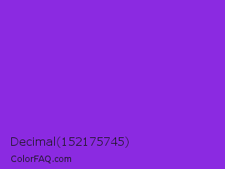 Decimal 152175745 Color is a normal purple color and the nearest color is Blue Violet #8a2be2. Hex code #8b2ae1 and RGB value is rgb(139,42,225). In RGB color space, this color is composed of 55% red, 16% green, 88% blue, In CMYK color space, this color is composed of 38% cyan, 81% magenta, 0% yellow , 12% black , In HSL color space, this color has a hue angle of 272° , 75% saturation and 52% lightness.