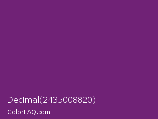 Decimal 2435008820 Color is a dark magenta color and the nearest color is Midnight #702670. Hex code #702276 and RGB value is rgb(112,34,118). In RGB color space, this color is composed of 44% red, 13% green, 46% blue, In CMYK color space, this color is composed of 5% cyan, 71% magenta, 0% yellow , 54% black , In HSL color space, this color has a hue angle of 296° , 55% saturation and 30% lightness.
