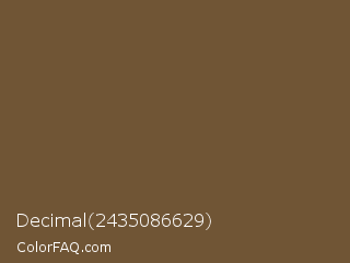 Decimal 2435086629 Color is a normal orange color and the nearest color is Tuscan Brown Coffee #6f4e37. Hex code #705535 and RGB value is rgb(112,85,53). In RGB color space, this color is composed of 44% red, 33% green, 21% blue, In CMYK color space, this color is composed of 0% cyan, 24% magenta, 53% yellow , 56% black , In HSL color space, this color has a hue angle of 33° , 36% saturation and 32% lightness.