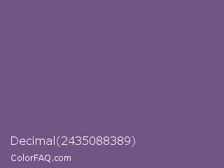 Decimal 2435088389 Color is a normal purple color and the nearest color is Dark Lavender #734f96. Hex code #705585 and RGB value is rgb(112,85,133). In RGB color space, this color is composed of 44% red, 33% green, 52% blue, In CMYK color space, this color is composed of 16% cyan, 36% magenta, 0% yellow , 48% black , In HSL color space, this color has a hue angle of 274° , 22% saturation and 43% lightness.