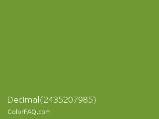 Decimal 2435207985 Color is a normal green color and the nearest color is Palm Leaf #6f9940. Hex code #709933 and RGB value is rgb(112,153,51). In RGB color space, this color is composed of 44% red, 60% green, 20% blue, In CMYK color space, this color is composed of 27% cyan, 0% magenta, 67% yellow , 40% black , In HSL color space, this color has a hue angle of 84° , 50% saturation and 40% lightness.