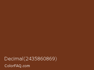 Decimal 2435860869 Color is a dark orange color and the nearest color is Peanut #782f16. Hex code #713419 and RGB value is rgb(113,52,25). In RGB color space, this color is composed of 44% red, 20% green, 10% blue, In CMYK color space, this color is composed of 0% cyan, 54% magenta, 78% yellow , 56% black , In HSL color space, this color has a hue angle of 18° , 64% saturation and 27% lightness.