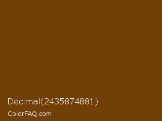 Decimal 2435874881 Color is a dark orange color and the nearest color is Cafe Royale #6f440c. Hex code #714009 and RGB value is rgb(113,64,9). In RGB color space, this color is composed of 44% red, 25% green, 4% blue, In CMYK color space, this color is composed of 0% cyan, 43% magenta, 92% yellow , 56% black , In HSL color space, this color has a hue angle of 32° , 85% saturation and 24% lightness.