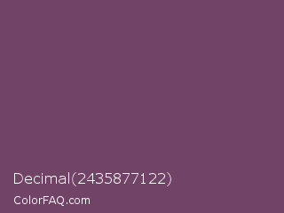 Decimal 2435877122 Color is a normal magenta color and the nearest color is Cosmic #76395d. Hex code #714366 and RGB value is rgb(113,67,102). In RGB color space, this color is composed of 44% red, 26% green, 40% blue, In CMYK color space, this color is composed of 0% cyan, 41% magenta, 10% yellow , 56% black , In HSL color space, this color has a hue angle of 314° , 26% saturation and 35% lightness.