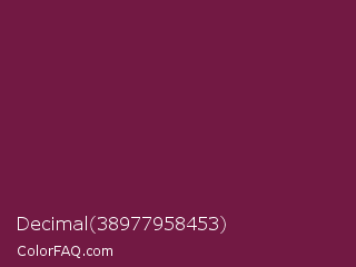 Decimal 38977958453 Color is a dark rose color and the nearest color is Pansy Purple #78184a. Hex code #721943 and RGB value is rgb(114,25,67). In RGB color space, this color is composed of 45% red, 10% green, 26% blue, In CMYK color space, this color is composed of 0% cyan, 78% magenta, 41% yellow , 55% black , In HSL color space, this color has a hue angle of 332° , 64% saturation and 27% lightness.