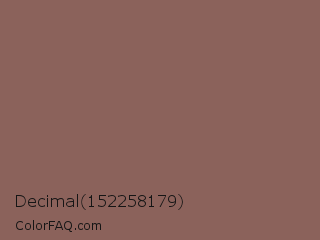 Decimal 152258179 Color is a normal red color and the nearest color is Rose Taupe #905d5d. Hex code #8b625b and RGB value is rgb(139,98,91). In RGB color space, this color is composed of 55% red, 38% green, 36% blue, In CMYK color space, this color is composed of 0% cyan, 29% magenta, 35% yellow , 45% black , In HSL color space, this color has a hue angle of 9° , 21% saturation and 45% lightness.