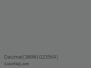 Decimal 38981023569 Color is a normal green color and the nearest color is Sonic Silver #757575. Hex code #767877 and RGB value is rgb(118,120,119). In RGB color space, this color is composed of 46% red, 47% green, 47% blue, In CMYK color space, this color is composed of 2% cyan, 0% magenta, 1% yellow , 53% black , In HSL color space, this color has a hue angle of 150° , 1% saturation and 47% lightness.