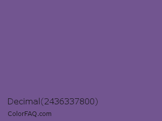 Decimal 2436337800 Color is a normal violet color and the nearest color is Dark Lavender #734f96. Hex code #725590 and RGB value is rgb(114,85,144). In RGB color space, this color is composed of 45% red, 33% green, 56% blue, In CMYK color space, this color is composed of 21% cyan, 41% magenta, 0% yellow , 44% black , In HSL color space, this color has a hue angle of 269° , 26% saturation and 45% lightness.