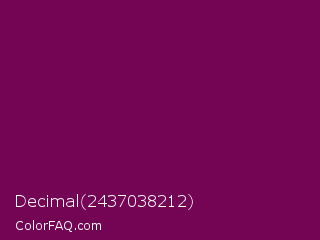Decimal 2437038212 Color is a dark magenta color and the nearest color is Rose Bud Cherry #800b47. Hex code #730554 and RGB value is rgb(115,5,84). In RGB color space, this color is composed of 45% red, 2% green, 33% blue, In CMYK color space, this color is composed of 0% cyan, 96% magenta, 27% yellow , 55% black , In HSL color space, this color has a hue angle of 317° , 92% saturation and 24% lightness.
