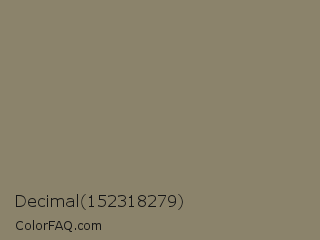 Decimal 152318279 Color is a normal orange color and the nearest color is Olive Haze #8b8470. Hex code #8b836b and RGB value is rgb(139,131,107). In RGB color space, this color is composed of 55% red, 51% green, 42% blue, In CMYK color space, this color is composed of 0% cyan, 6% magenta, 23% yellow , 45% black , In HSL color space, this color has a hue angle of 45° , 13% saturation and 48% lightness.