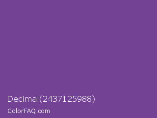Decimal 2437125988 Color is a normal purple color and the nearest color is Affair #714693. Hex code #734294 and RGB value is rgb(115,66,148). In RGB color space, this color is composed of 45% red, 26% green, 58% blue, In CMYK color space, this color is composed of 22% cyan, 55% magenta, 0% yellow , 42% black , In HSL color space, this color has a hue angle of 276° , 38% saturation and 42% lightness.