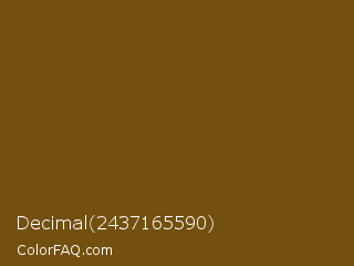 Decimal 2437165590 Color is a dark orange color and the nearest color is Raw Umber #734a12. Hex code #735010 and RGB value is rgb(115,80,16). In RGB color space, this color is composed of 45% red, 31% green, 6% blue, In CMYK color space, this color is composed of 0% cyan, 30% magenta, 86% yellow , 55% black , In HSL color space, this color has a hue angle of 39° , 76% saturation and 26% lightness.