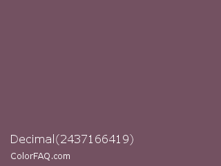 Decimal 2437166419 Color is a normal rose color and the nearest color is Russett #755a57. Hex code #735161 and RGB value is rgb(115,81,97). In RGB color space, this color is composed of 45% red, 32% green, 38% blue, In CMYK color space, this color is composed of 0% cyan, 30% magenta, 16% yellow , 55% black , In HSL color space, this color has a hue angle of 332° , 17% saturation and 38% lightness.