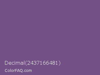 Decimal 2437166481 Color is a normal purple color and the nearest color is Dark Lavender #734f96. Hex code #735187 and RGB value is rgb(115,81,135). In RGB color space, this color is composed of 45% red, 32% green, 53% blue, In CMYK color space, this color is composed of 15% cyan, 40% magenta, 0% yellow , 47% black , In HSL color space, this color has a hue angle of 278° , 25% saturation and 42% lightness.