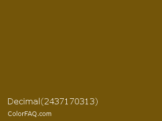 Decimal 2437170313 Color is a dark orange color and the nearest color is Antique Bronze #704a07. Hex code #735509 and RGB value is rgb(115,85,9). In RGB color space, this color is composed of 45% red, 33% green, 4% blue, In CMYK color space, this color is composed of 0% cyan, 26% magenta, 92% yellow , 55% black , In HSL color space, this color has a hue angle of 43° , 85% saturation and 24% lightness.