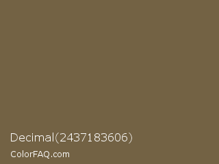 Decimal 2437183606 Color is a normal orange color and the nearest color is Tobacco Brown #715d47. Hex code #736244 and RGB value is rgb(115,98,68). In RGB color space, this color is composed of 45% red, 38% green, 27% blue, In CMYK color space, this color is composed of 0% cyan, 15% magenta, 41% yellow , 55% black , In HSL color space, this color has a hue angle of 38° , 26% saturation and 36% lightness.