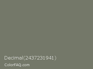Decimal 2437231941 Color is a normal green color and the nearest color is Limed Ash #747d63. Hex code #737869 and RGB value is rgb(115,120,105). In RGB color space, this color is composed of 45% red, 47% green, 41% blue, In CMYK color space, this color is composed of 4% cyan, 0% magenta, 13% yellow , 53% black , In HSL color space, this color has a hue angle of 80° , 7% saturation and 44% lightness.