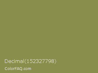 Decimal 152327798 Color is a normal yellow color and the nearest color is Dark Tan #918151. Hex code #8b8d4c and RGB value is rgb(139,141,76). In RGB color space, this color is composed of 55% red, 55% green, 30% blue, In CMYK color space, this color is composed of 1% cyan, 0% magenta, 46% yellow , 45% black , In HSL color space, this color has a hue angle of 62° , 30% saturation and 43% lightness.