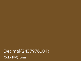 Decimal 2437976104 Color is a dark orange color and the nearest color is Dallas #6e4b26. Hex code #745124 and RGB value is rgb(116,81,36). In RGB color space, this color is composed of 45% red, 32% green, 14% blue, In CMYK color space, this color is composed of 0% cyan, 30% magenta, 69% yellow , 55% black , In HSL color space, this color has a hue angle of 34° , 53% saturation and 30% lightness.