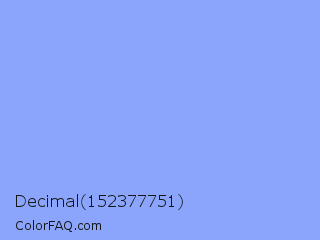 Decimal 152377751 Color is a light blue color and the nearest color is Portage #8b9fee. Hex code #8ba5fd and RGB value is rgb(139,165,253). In RGB color space, this color is composed of 55% red, 65% green, 99% blue, In CMYK color space, this color is composed of 45% cyan, 35% magenta, 0% yellow , 1% black , In HSL color space, this color has a hue angle of 226° , 97% saturation and 77% lightness.
