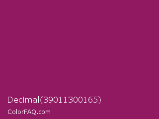 Decimal 39011300165 Color is a normal magenta color and the nearest color is Dark Raspberry #872657. Hex code #901961 and RGB value is rgb(144,25,97). In RGB color space, this color is composed of 56% red, 10% green, 38% blue, In CMYK color space, this color is composed of 0% cyan, 83% magenta, 33% yellow , 44% black , In HSL color space, this color has a hue angle of 324° , 70% saturation and 33% lightness.