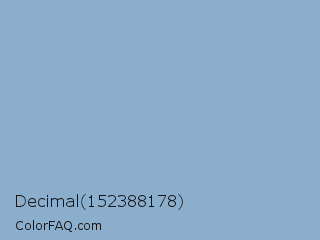 Decimal 152388178 Color is a light blue color and the nearest color is Polo Blue #8da8cc. Hex code #8baecc and RGB value is rgb(139,174,204). In RGB color space, this color is composed of 55% red, 68% green, 80% blue, In CMYK color space, this color is composed of 32% cyan, 15% magenta, 0% yellow , 20% black , In HSL color space, this color has a hue angle of 208° , 39% saturation and 67% lightness.