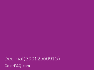 Decimal 39012560915 Color is a normal magenta color and the nearest color is Razzmic Berry Crayola #843179. Hex code #922385 and RGB value is rgb(146,35,133). In RGB color space, this color is composed of 57% red, 14% green, 52% blue, In CMYK color space, this color is composed of 0% cyan, 76% magenta, 9% yellow , 43% black , In HSL color space, this color has a hue angle of 307° , 61% saturation and 35% lightness.