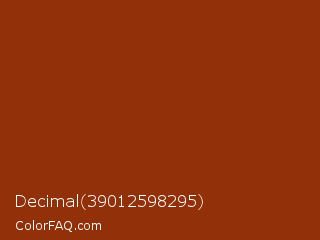 Decimal 39012598295 Color is a dark orange color and the nearest color is Smokey Topaz #832a0d. Hex code #923009 and RGB value is rgb(146,48,9). In RGB color space, this color is composed of 57% red, 19% green, 4% blue, In CMYK color space, this color is composed of 0% cyan, 67% magenta, 94% yellow , 43% black , In HSL color space, this color has a hue angle of 17° , 88% saturation and 30% lightness.