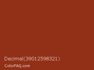Decimal 39012598321 Color is a normal red color and the nearest color is Kobe #882d17. Hex code #923017 and RGB value is rgb(146,48,23). In RGB color space, this color is composed of 57% red, 19% green, 9% blue, In CMYK color space, this color is composed of 0% cyan, 67% magenta, 84% yellow , 43% black , In HSL color space, this color has a hue angle of 12° , 73% saturation and 33% lightness.