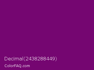 Decimal 2438288449 Color is a dark magenta color and the nearest color is Patriarch #800080. Hex code #750671 and RGB value is rgb(117,6,113). In RGB color space, this color is composed of 46% red, 2% green, 44% blue, In CMYK color space, this color is composed of 0% cyan, 95% magenta, 3% yellow , 54% black , In HSL color space, this color has a hue angle of 302° , 90% saturation and 24% lightness.