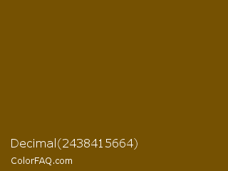 Decimal 2438415664 Color is a dark orange color and the nearest color is Antique Bronze #704a07. Hex code #755102 and RGB value is rgb(117,81,2). In RGB color space, this color is composed of 46% red, 32% green, 1% blue, In CMYK color space, this color is composed of 0% cyan, 31% magenta, 98% yellow , 54% black , In HSL color space, this color has a hue angle of 41° , 97% saturation and 23% lightness.