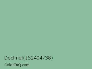 Decimal 152404738 Color is a light green color and the nearest color is Eton Blue #96c8a2. Hex code #8bbe9e and RGB value is rgb(139,190,158). In RGB color space, this color is composed of 55% red, 75% green, 62% blue, In CMYK color space, this color is composed of 27% cyan, 0% magenta, 17% yellow , 25% black , In HSL color space, this color has a hue angle of 142° , 28% saturation and 65% lightness.