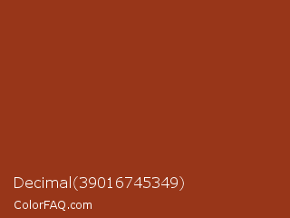 Decimal 39016745349 Color is a normal red color and the nearest color is Prairie Sand #9a3820. Hex code #983619 and RGB value is rgb(152,54,25). In RGB color space, this color is composed of 60% red, 21% green, 10% blue, In CMYK color space, this color is composed of 0% cyan, 64% magenta, 84% yellow , 40% black , In HSL color space, this color has a hue angle of 14° , 72% saturation and 35% lightness.