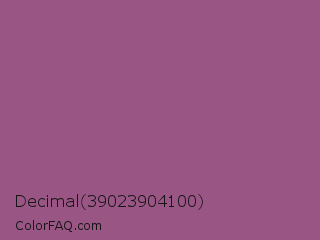 Decimal 39023904100 Color is a normal magenta color and the nearest color is Antique Fuchsia #915c83. Hex code #995584 and RGB value is rgb(153,85,132). In RGB color space, this color is composed of 60% red, 33% green, 52% blue, In CMYK color space, this color is composed of 0% cyan, 44% magenta, 14% yellow , 40% black , In HSL color space, this color has a hue angle of 319° , 29% saturation and 47% lightness.