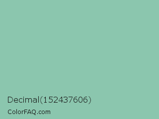 Decimal 152437606 Color is a light green color and the nearest color is Summer Green #96bbab. Hex code #8bc6ae and RGB value is rgb(139,198,174). In RGB color space, this color is composed of 55% red, 78% green, 68% blue, In CMYK color space, this color is composed of 30% cyan, 0% magenta, 12% yellow , 22% black , In HSL color space, this color has a hue angle of 156° , 34% saturation and 66% lightness.