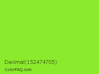 Decimal 152474705 Color is a normal green color and the nearest color is Kiwi #8ee53f. Hex code #8bea2b and RGB value is rgb(139,234,43). In RGB color space, this color is composed of 55% red, 92% green, 17% blue, In CMYK color space, this color is composed of 41% cyan, 0% magenta, 82% yellow , 8% black , In HSL color space, this color has a hue angle of 90° , 82% saturation and 54% lightness.