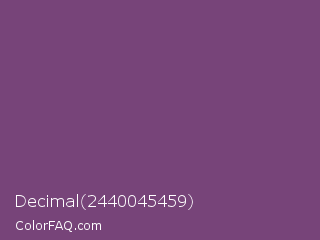 Decimal 2440045459 Color is a normal magenta color and the nearest color is Maximum Purple #733380. Hex code #774479 and RGB value is rgb(119,68,121). In RGB color space, this color is composed of 47% red, 27% green, 47% blue, In CMYK color space, this color is composed of 2% cyan, 44% magenta, 0% yellow , 53% black , In HSL color space, this color has a hue angle of 298° , 28% saturation and 37% lightness.