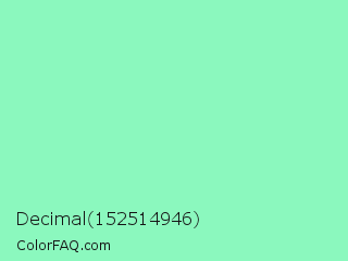 Decimal 152514946 Color is a light green color and the nearest color is Teal Deer #99e6b3. Hex code #8bf8be and RGB value is rgb(139,248,190). In RGB color space, this color is composed of 55% red, 97% green, 75% blue, In CMYK color space, this color is composed of 44% cyan, 0% magenta, 23% yellow , 3% black , In HSL color space, this color has a hue angle of 148° , 89% saturation and 76% lightness.