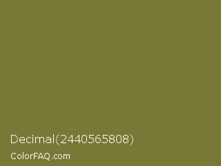 Decimal 2440565808 Color is a normal yellow color and the nearest color is Pesto #7c7631. Hex code #787936 and RGB value is rgb(120,121,54). In RGB color space, this color is composed of 47% red, 47% green, 21% blue, In CMYK color space, this color is composed of 1% cyan, 0% magenta, 55% yellow , 53% black , In HSL color space, this color has a hue angle of 61° , 38% saturation and 34% lightness.
