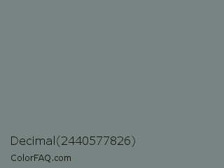 Decimal 2440577826 Color is a normal cyan color and the nearest color is Blue Smoke #748881. Hex code #788482 and RGB value is rgb(120,132,130). In RGB color space, this color is composed of 47% red, 52% green, 51% blue, In CMYK color space, this color is composed of 9% cyan, 0% magenta, 2% yellow , 48% black , In HSL color space, this color has a hue angle of 170° , 5% saturation and 49% lightness.