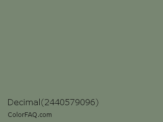Decimal 2440579096 Color is a normal green color and the nearest color is Camouflage Green #78866b. Hex code #788672 and RGB value is rgb(120,134,114). In RGB color space, this color is composed of 47% red, 53% green, 45% blue, In CMYK color space, this color is composed of 10% cyan, 0% magenta, 15% yellow , 47% black , In HSL color space, this color has a hue angle of 102° , 8% saturation and 49% lightness.