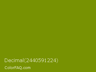 Decimal 2440591224 Color is a dark lime color and the nearest color is Limeade #6f9d02. Hex code #789202 and RGB value is rgb(120,146,2). In RGB color space, this color is composed of 47% red, 57% green, 1% blue, In CMYK color space, this color is composed of 18% cyan, 0% magenta, 99% yellow , 43% black , In HSL color space, this color has a hue angle of 71° , 97% saturation and 29% lightness.