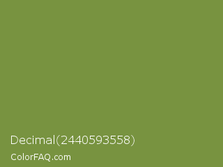 Decimal 2440593558 Color is a normal green color and the nearest color is Palm Leaf #6f9940. Hex code #789340 and RGB value is rgb(120,147,64). In RGB color space, this color is composed of 47% red, 58% green, 25% blue, In CMYK color space, this color is composed of 18% cyan, 0% magenta, 56% yellow , 42% black , In HSL color space, this color has a hue angle of 80° , 39% saturation and 41% lightness.