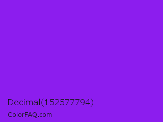 Decimal 152577794 Color is a normal purple color and the nearest color is Blue Violet #8a2be2. Hex code #8c1dee and RGB value is rgb(140,29,238). In RGB color space, this color is composed of 55% red, 11% green, 93% blue, In CMYK color space, this color is composed of 41% cyan, 88% magenta, 0% yellow , 7% black , In HSL color space, this color has a hue angle of 272° , 86% saturation and 52% lightness.