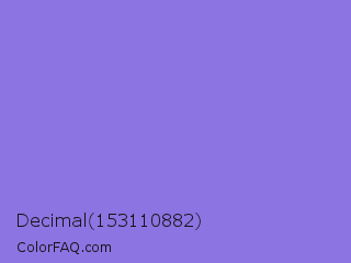 Decimal 153110882 Color is a light indigo color and the nearest color is Medium Purple #9370db. Hex code #8c74e2 and RGB value is rgb(140,116,226). In RGB color space, this color is composed of 55% red, 45% green, 89% blue, In CMYK color space, this color is composed of 38% cyan, 49% magenta, 0% yellow , 11% black , In HSL color space, this color has a hue angle of 253° , 65% saturation and 67% lightness.