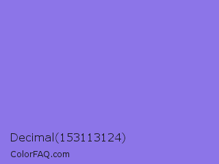 Decimal 153113124 Color is a light indigo color and the nearest color is Medium Purple #9370db. Hex code #8c75e8 and RGB value is rgb(140,117,232). In RGB color space, this color is composed of 55% red, 46% green, 91% blue, In CMYK color space, this color is composed of 40% cyan, 50% magenta, 0% yellow , 9% black , In HSL color space, this color has a hue angle of 252° , 71% saturation and 68% lightness.