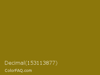 Decimal 153113877 Color is a dark yellow color and the nearest color is Corn Harvest #8b6b0b. Hex code #8c770b and RGB value is rgb(140,119,11). In RGB color space, this color is composed of 55% red, 47% green, 4% blue, In CMYK color space, this color is composed of 0% cyan, 15% magenta, 92% yellow , 45% black , In HSL color space, this color has a hue angle of 50° , 85% saturation and 30% lightness.