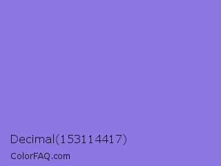 Decimal 153114417 Color is a light indigo color and the nearest color is Medium Purple #9370db. Hex code #8c77e3 and RGB value is rgb(140,119,227). In RGB color space, this color is composed of 55% red, 47% green, 89% blue, In CMYK color space, this color is composed of 38% cyan, 48% magenta, 0% yellow , 11% black , In HSL color space, this color has a hue angle of 252° , 66% saturation and 68% lightness.