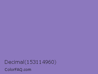 Decimal 153114960 Color is a light indigo color and the nearest color is Middle Blue Purple #8b72be. Hex code #8c78be and RGB value is rgb(140,120,190). In RGB color space, this color is composed of 55% red, 47% green, 75% blue, In CMYK color space, this color is composed of 26% cyan, 37% magenta, 0% yellow , 25% black , In HSL color space, this color has a hue angle of 257° , 35% saturation and 61% lightness.
